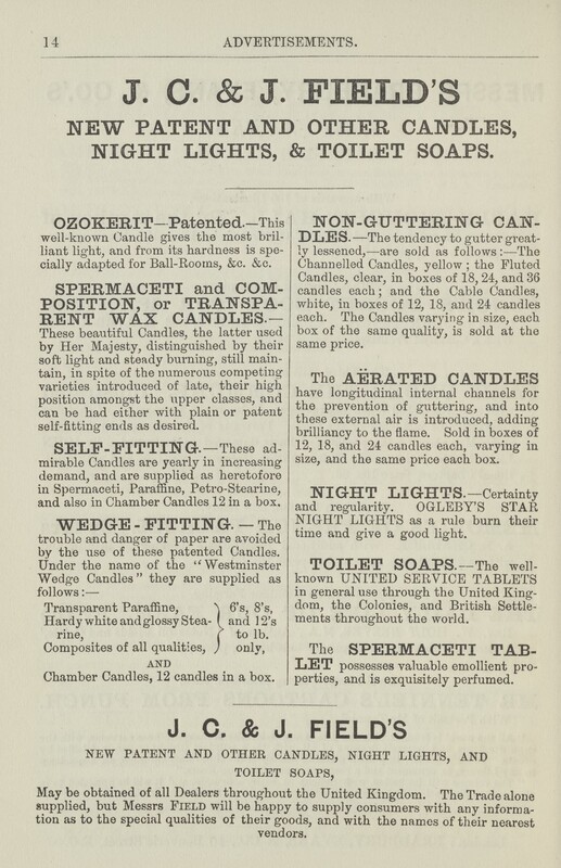 The language of patents and progress also reflect the ability of innovation to provide an improvement. Writing on Victorian patents, Clare Pettit comments that “concepts of creativity, originality, authenticity, and genius were much in everyone’s mind” (88) immediately after the Great Exhibition of 1851. The particular focus on the patent as an improvement is reflected in debates and opinion pieces from the Victorian period. Lyon Playfair, commenting on patents, remarks that “rewards for successful venture must be offered to all who have inventive faculties, in order that there may be a constant effort for improvement and progress” (58), and the Hansard records of debate on the Patent Bill reflect politicians in the House of Commons suggest that Victorians regarded patents as a way to provide “benefit to the country” (Wakley 1852), offering “valuable improvements” (Shelley 1858), and that theft of intellectual property should hold that “an individual was guilty of as flagrant a wrong who pirated another’s invention as the man who robbed his purse” (Carter 1852). The text of the Patent Bill amendment also reflects the value assigned to improvements: that the inventor believes they “will be of great Public Utility” (423). Lori Ann Loeb comments that in the early Victorian period, “it became popular to believe that the world could be bettered through sustained human effort and intelligence” (47). The advertisements in the 1871 and 1872 printings of Middlemarch often reflected an improvement of a product, rather than a new invention. Advertisements for patented candles, for example, do not purport to have invented a new kind of candle, but rather that they are improved to the point where a patent is needed to protect the intellectual effort that resulted in the innovation.