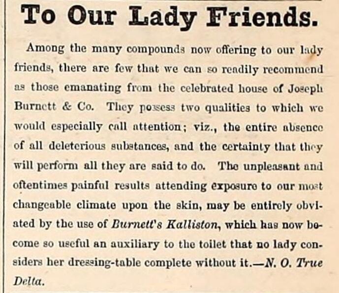 The illusion of being able to buy one's way into prestige culminates in the Burnett’s Kalliston advertisement, which does not even specify what the product is beyond being a cosmetic. Instead, the advertisement paints itself as an unspecified necessity for “our lady friends”, claiming to be “so useful an auxiliary to the toilet that no lady considers her dressing-table complete without it”. This advertisement tactic of painting the product as a must-have heightens its desirability and gives it the impression of being a panacea, which the ambiguity of its actual function aids in highlighting. This parallels how Magwitch uses Pip as a means of vicariously achieving gentility, as by investing all his wealth in turning Pip into a gentleman, Magwitch treats Pip as a cure-all. But as with how material goods have done nothing to actually fix his health or improve his appearance, “Magwitch’s poor approximation of genteel behaviour brings home the truth of the young gentleman’s position, with the problematic genealogy of Pip’s wealth making the ambivalent genealogy of his class identity acutely conspicuous” (Watson 499). All attempts to purchase gentility fail, revealing that regardless of the ability to attain wealth, class divisions cannot be bridged as the functions of class go beyond money, but into an arbitrary code of conduct as well. The Burnett’s advertisement seems to be aware of this, hence the vagueness, as the industry relies on selling the illusion of achieving an unattainable fantasy in order to profit